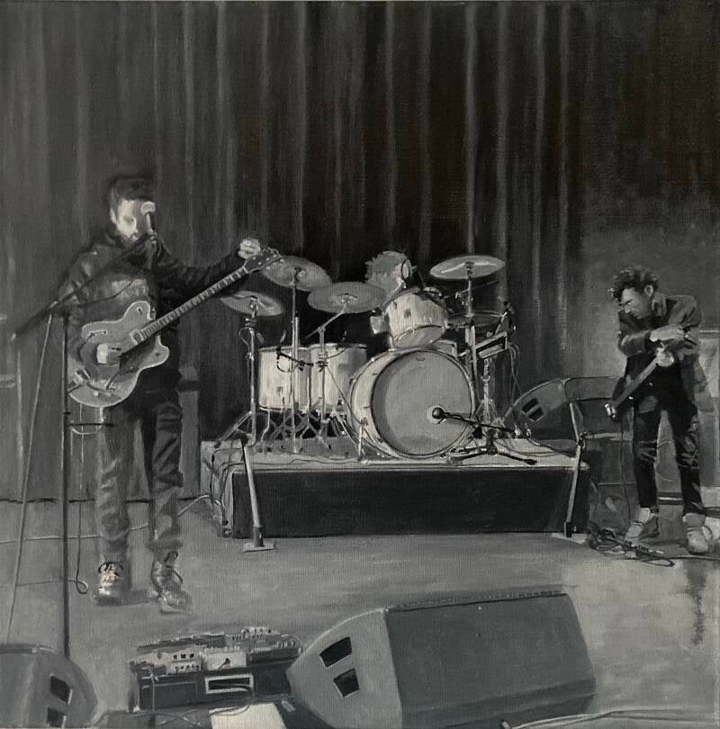 Op het podium staat de Haagse band Noblesse. De muzikanten nemen nog even een moment om hun instrumenten te checken.
